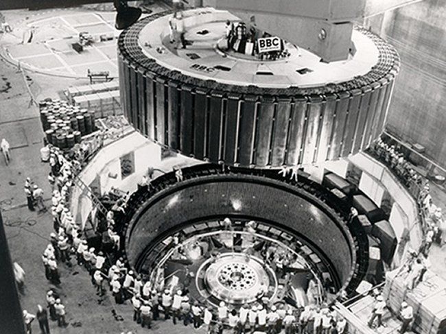 | Grenzgebiet Brasilien/Paraguay Wasserkraftwerk Itaipu am Rio Paraná Das obige Bild zeigt den Rotor (d = 16,0 m) eines der 18 Generatoren des Wasserkraftwerkes Itaipu bei dem Kupplungsvorgang mit der darunterliegenden Francis-Turbine. Foto: Aus dem Besitz von ABB-Mannheim |