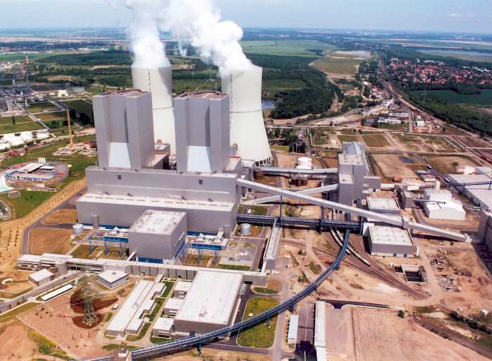 | 03.06.2002 - Kraftwerk Lippendorf: Block R und S Oben im Bild sind die beiden Kühltürme von Block R (links) und S zu erkennen. Über die Kühltürme werden auch die gereinigten Abgase der Kessel in die Atmosphäre entlassen, daher gibt es bei diesem Kraftwerk keine Schornsteine. Zwischen den Kühltürmen und Kesselhäusern befinden sich die Rauchgasreinigungs- und Entschwefelungsanlagen. Die Kesselhäuser für die Blöcke R (links) und S kann man vor den Kühltürmen erkennen. (Sehen aus wie Hochhäuser, jedoch ohne Fenster) Vor den beiden Kesseln befindet sich das Maschinenhaus mit den beiden Dampfturbogruppen Block R (links) und S und den zugehörigen SPAT´s. In dem hohen schmalen Teil des Maschinenhauses befinden sich ganz oben die Speisewasserbehälter für die beiden Kraftwerksblöcke. Das kleine Gebäude" vor dem Maschinenhaus ist das Schaltanlagengebäude In diesem Gebäude befinden sich die Warte, Elektronik- und Schaltanlagen-Räume für die beiden Blöcke R und S. Dort stehen auch unsere Elektronikschränke. Foto: Vattenfall |