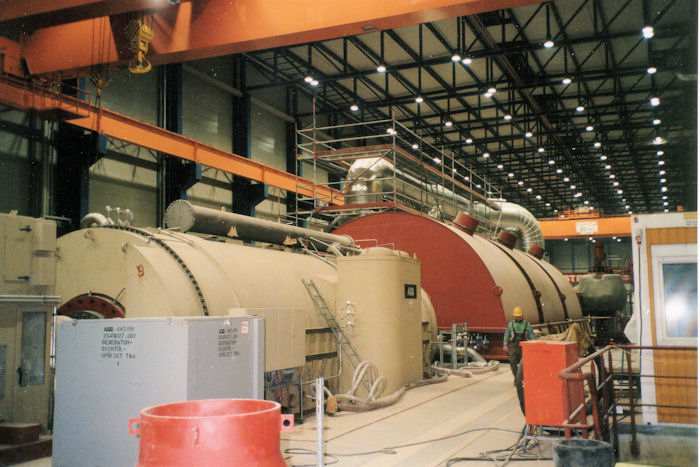 | 28.01.1999 - Kraftwerk Lippendorf: Block R und S Block S: Turbogenerator der Dampfturbogruppe Im Vordergrund ist der große Turbogenerator und dahinter sind die drei ND-Turbinen ND1, ND2 und ND3 zu erkennen. Foto: Andreas Kunz |