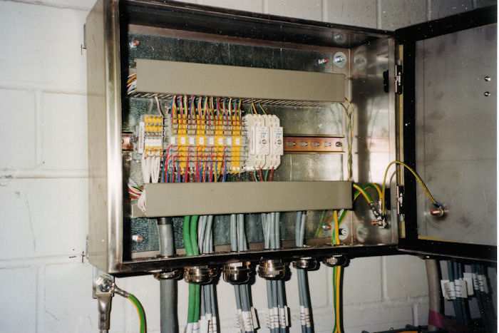 | 28.01.1999 - Kraftwerk Lippendorf: Block R und S Block S: SPAT - Unterverteiler Die Anschlusstechnik im Unterverteiler erfolgt über Maxi-Termi-Point. Die beiden weißen Geräte (rechts) sind programmierbare Temperatur-Messumformer. Das dicke Kabel (links) ist ein Stammkabel und führt direkt zu unserem Signalverteiler S0CJK04. Die dünneren grünen Kabel führen zu den Temperatur-Messwertaufnehmern. (NiCr-Ni - Elemente) Foto: Andreas Kunz |