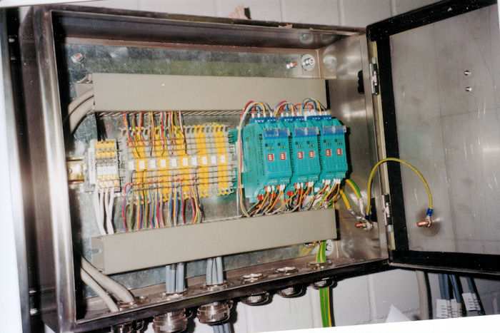 | 28.01.1999 - Kraftwerk Lippendorf: Block R und S Block S: SPAT - Unterverteiler Bei den grünen Geräten (rechts) handelt es sich um Trennschaltverstärker der Firma Pepperl + Fuchs. Wir mussten diese Geräte vor unsere binären Eingabegeräte schalten, da diese keine Initiatoren (kontaktlose Näherungsschalter) verarbeiten können, Foto: Andreas Kunz |