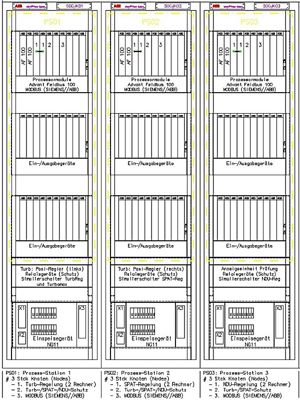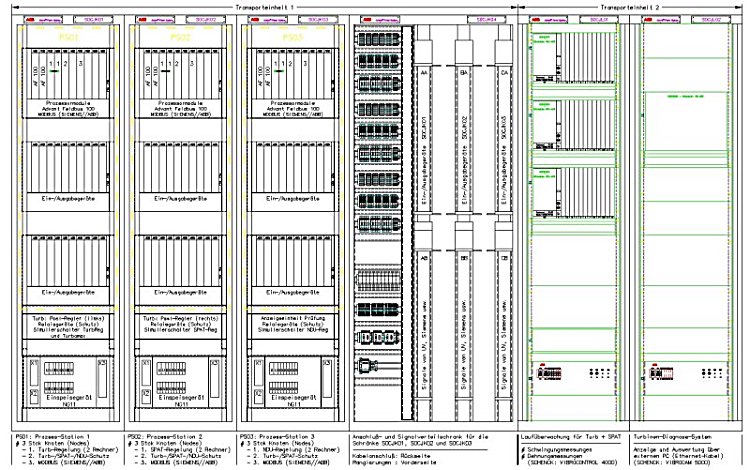 | Kraftwerk Lippendorf: Block R und S Block S: ABB-Elektronikschränke für die Basisleittechnik Transporteinheit 1: S0CJK01/02/03/04 Transporteinheit 2: S0CJL01/02 S0CJK01: Turbinenregelung und Turb-, SPAT- und NDU-Schutz Kanal 1 S0CJK02: SPAT-Regelung und Turb-, SPAT- und NDU-Schutz Kanal 2 S0CJK03: NDU-Regelung und Turb-, SPAT- und NDU-Schutz Kanal 3 Die Prüfgruppen wurden auf die Schutzrechner aufgeteilt. In jedem Schrank befindet sich noch je ein separater Rechner für den Signalaustausch mit der Firma SIEMENS per Modbus. S0CJK04: Signalverteiler, hier enden die Kabel von unseren Ein- und Ausgabegeräten, den Unterverteilern vor Ort und der Hauptleittechnik (Firma SIEMENS) Anschlusstechnik in Maxi-Termi-Point. Insgesamt 8 x 100 x 6 = 4800 Anschlusspunkte. Die Kabel von den Geräten, Unterverteiler usw. werden auf der Rückseite angeschlossen. Auf der Vorderseite des Signalverteilers wird rangiert. S0CJL01: Laufüberwachung für die Dampfturbogruppe und die SPAT S0CJL02: Schwingungs-Diagnosesystem für die Dampfturbogruppe. Die Messwertaufnehmer und Elektronikgeräte für diese beiden Systeme haben wir bei der Firma Schenck in Darmstadt eingekauft. Zeichnung: Eckhard Schmidt - Kappeln |