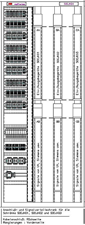 | Kraftwerk Lippendorf: Block R und S Block S: ABB-Elektronikschränke für die Basisleittechnik Der Signalverteilerschrank: S0CJK04 Die Schränke für den Block R sind gleich aufgebaut. Die Kodierung der Schänke beginnt dort mit dem Buchstaben R" - z.B. R0CJK01. Zeichnung: Eckhard Schmidt - Kappeln |