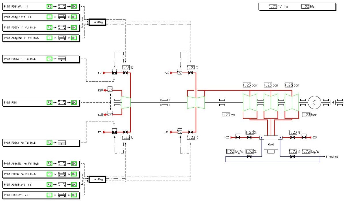 | Kraftwerk Lippendorf: Block R und S Bedienbild der Prüfung Ventile Turbine Bei diesem Bild handelt es sich um eine Aufgabenstellung für die Firma SIEMENS. (Ausgeblendet sind die zugehörigen Kennzeichen) Rechner für die Prüfung Ventile Block S: S0CJK02BA005 In dem Rechner ist auch das komplette Programm für die Prüfung Ventile hinterlegt. Siehe auch Liste der Funktionsgruppen (Bild 2). Eckhard Schmidt - Kappeln |