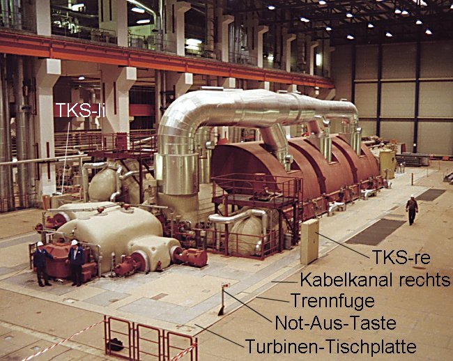| 18.06.1999 - Kraftwerk Lippendorf: Block R und S Block S: Dampfturbogruppe mit den beiden Turbinenklemmenschränken TKS-li: Turbinen-Klemmen-Schrank links - S0MYA11GF201 (KKS des Schrankes) TKS-re: Turbinen-Klemmen-Schrank rechts - S0MYA12GF201 (KKS des Schrankes) KKS = Kraftwerks-Kennzeichnungs-System Alle Schränke, Armaturen, Rohrleitungen, Messungen, Schaltanlagen, Gebäude, Stromlauf- und Funktionspläne, Signale in den Funktionsplänen usw. sind im Kraftwerk gemäß den KKS-Richtlinien kodiert. Auf dem obigen Bild kann man die Turbinen-Tischplatte gut erkennen. Sie hebt sich durch die hellere Farbe deutlich vom Maschinenhausflur ab. Die seitlichen Kabelkanäle im Turbinenfundament (Tischplatte) sind nach oben hin mit Flurplatten (Riffel-Blechplatten) abgedeckt. Die komplette Turbogruppe wird später noch mit einer Schallschutzhaube abgedeckt. (Siehe Kapitel: ABB-420 -> letztes Bild) Mit der Not-Aus-Taste kann im Notfall der Turbinenschnellschluss eingeleitet werden. Beim Betätigen dieser Taste schließen die Schnellschlussventile der HD-Turbine und die Schnellschlussklappen der MD-Turbine. Durch den Druckanstieg in der HZÜ-Dampfleitung öffnen sich sofort die ND-Bypass-Stellventile, um den Dampf an der Turbine vorbei in den Kondensator zu leiten. Der ganze Vorgang läuft nicht gerade lautlos ab. Eckhard Schmidt - Kappeln |