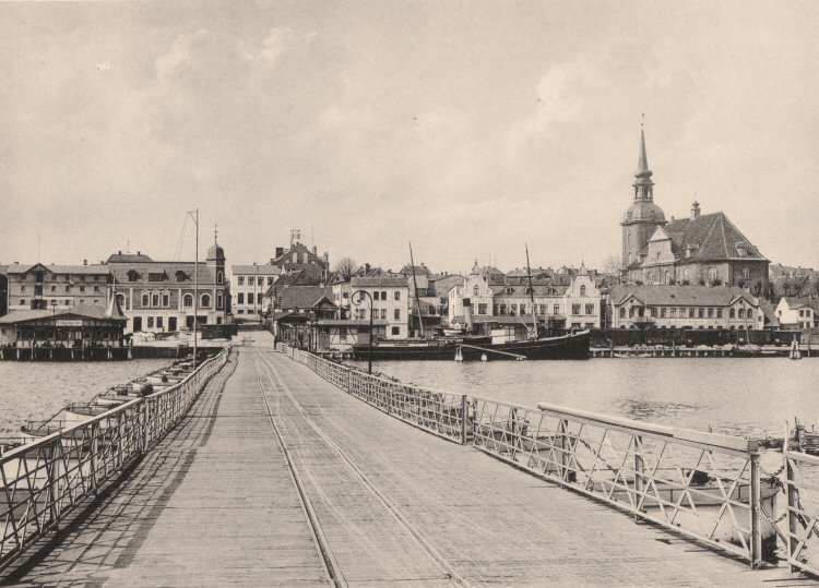| Pontonbrücke (ca. 1910) Die Pontonbrücke lag von 1867 bis 1925 an dieser Stelle. 1925 wurde diese Brücke etwas weiter nach Süden verschwenkt, da an dieser Stelle eine Drehbrücke (1925 - 1927) gebaut wurde. Die Drehbrücke gibt es heute (2004) auch nicht mehr. (Foto: Kappeln - Stadtarchiv) |