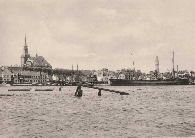 | Panorama von Kappeln/Schlei (ca. 1910) Alle Schwarzweißaufnahmen in diesem Beitrag stammen aus dem Bildband Kappeln", erschienen im Verlag Kock´s Buchhandlung - Kappeln. In dem Bildband ist kein Erscheinungsdatum angegeben. Fast alle Bilder habe ich noch einmal aus der heutigen Sicht (2004) aufgenommen. (Foto: Kappeln - Stadtarchiv) |