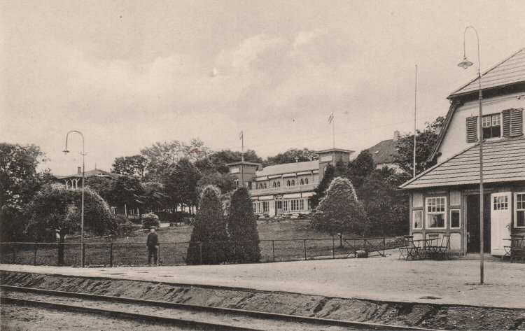| Strandhotel (ca. 1910) Das Strandhotel ist das Gebäude in der Bildmitte. Das Strandhotel gibt es heute (2004) nicht mehr. Heute steht dort ein großes Gebäude mit Eigentumswohnungen. Das Gebäude rechts im Bild ist das Bahnhofsgebäude der Schleswiger Kreisbahn (siehe Schienen im Vordergrund). Die Bahnstrecke Süderbrarup - Kappeln wurde am 21. Dezember 1904 eröffnet. Die Strecke feiert in diesem Jahr das 100-jährige Bestehen. Die Bahnstrecke wird nur noch von der Museumsbahn genutzt. (Foto: Kappeln - Stadtarchiv) |
