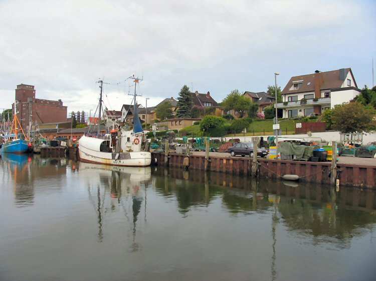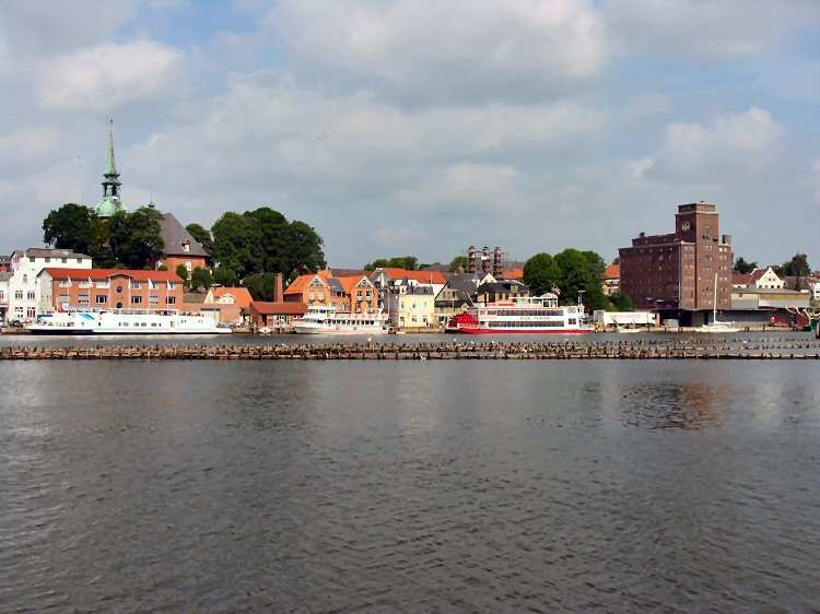 | Nordhafen (7. Juni 2004) Links im Bild ist der rechte Giebel vom damaligen Bahnhofshotel zu erkennen. In dem Gebäude befindet sich heute das Café Kö. Rechts im Bild ist der Getreidespeicher der Getreide AG zu erkennen. Dieser Speicher wurde 1936 fertiggestellt. Der Speicher wird schon seit einigen Jahren nicht mehr genutzt. An der Pier liegen die Ausflugsschiffe (von links nach rechts): STADT KAPPELN, FÖRDE PRINCESS und SCHLEI PRINCESS. Ganz rechts im Bild beginnt der Fischereihafen von Kappeln. Dort machen die letzten Fischkutter von Kappeln fest. Die Anzahl hat in den letzten Jahren auch stark abgenommen. |
