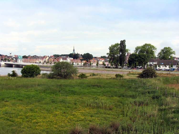 | Panorama von Kappeln/Schlei (6. Juni 2004) Das Panorama von Kappeln hat sich doch im Laufe der Zeit stark gewandelt. Die Pontonbrücke (siehe Bild oben) wurde im Jahre 1927 durch eine Drehbrücke ersetzt. Die Drehbrücke wurde 2002 durch eine Klappbrücke ersetzt. Den Wasserturm gibt es auch schon seit vielen Jahren nicht mehr. Am Standort des Elektrizitätswerkes von Martin Klencke steht heute ein Backsteinspeicher der Getreide AG. Dieser Speicher wird auch schon seit einigen Jahren nicht mehr genutzt. |