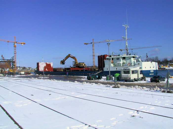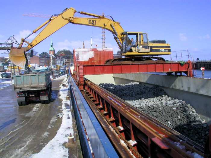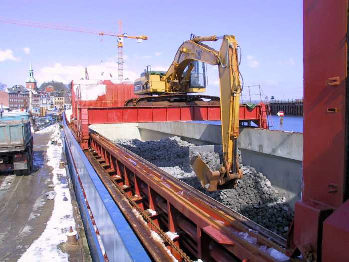 | 20.03.2001 - 12:14 Uhr - Kappeln/Schlei: Neubau einer Klappbrücke Südhafen Die Granitsteine werden mit Hilfe des bordeigenen Hydraulikbaggers auf LKWs verladen und zum Alten Zimmerplatz" transportiert. Foto: Eckhard Schmidt - Kappeln - (C) 2001 |