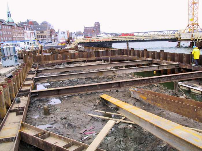 | 22.03.2001 - 11:36 Uhr - Kappeln/Schlei: Neubau einer Klappbrücke Südhafen / Widerlager 70 / Unterführung Blick von Süden auf die Baugrube vom Widerlager 70. Der obere Gurt wurde noch durch zusätzliche Träger zwischen der Innen- und Außenspundwand weiter versteift. Foto: Eckhard Schmidt - Kappeln - (C) 2001 |