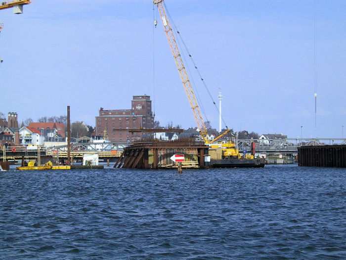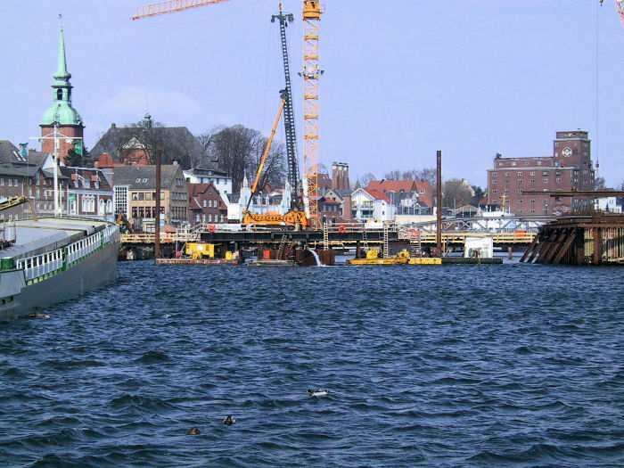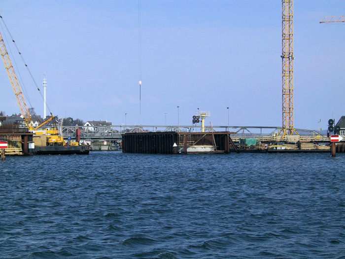 | 23.03.2001 - 12:13 Uhr - Kappeln/Schlei: Neubau einer Klappbrücke Pfeiler 50 Blick vom Südhafen hinüber zum Baugerüst vom Pfeiler 50. Es werden gerade die letzten Traversen mit den Absenkvorrichtungen montiert. Foto: Eckhard Schmidt - Kappeln - (C) 2001 |