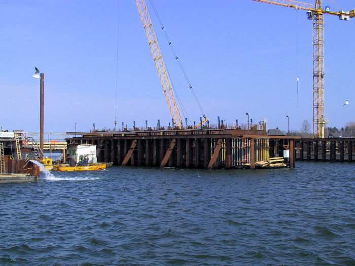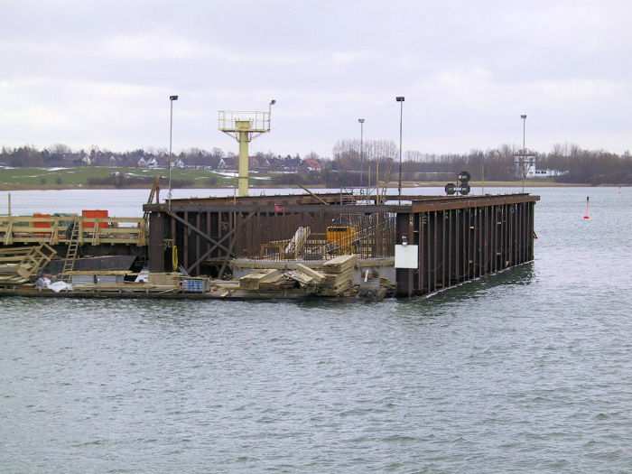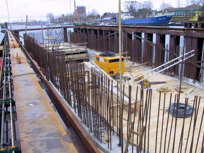 | 23.03.2001 - 12:08 Uhr - Kappeln/Schlei: Neubau einer Klappbrücke Pfeiler 40 Blick von Süden in Richtung Baugerüst vom Pfeiler 40. Hier wurden bereits alle Traversen mit den Absenkvorrichtungen demontiert. Der Pfeiler steht jetzt auf eigenen Füßen". Foto: Eckhard Schmidt - Kappeln - (C) 2001 |
