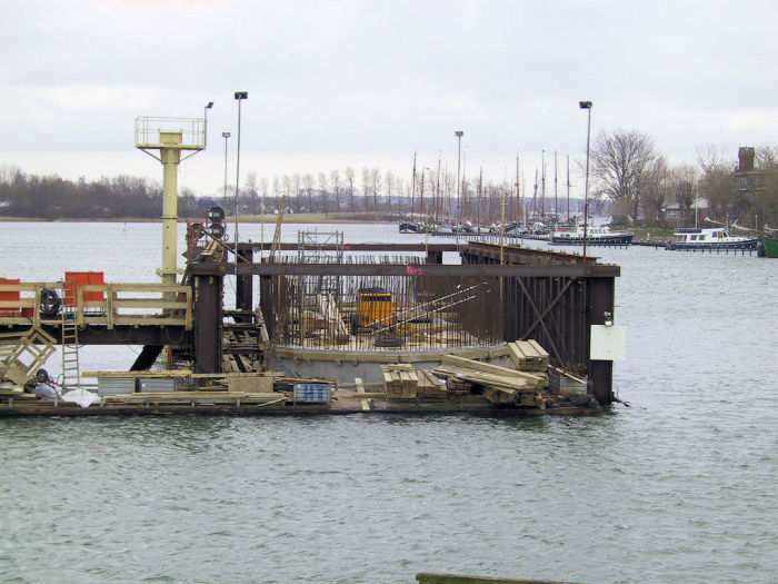 | 23.03.2001 - 12:07 Uhr - Kappeln/Schlei: Neubau einer Klappbrücke Pfeiler 60 Der Katamaran mit der Ramme wurde über die Baugrube vom Pfeiler 60 gefahren. In der kommenden Woche solle die VM-Pfähle gerammt werden. Foto: Eckhard Schmidt - Kappeln - (C) 2001 |