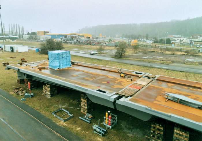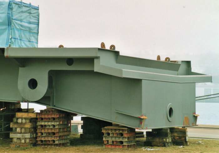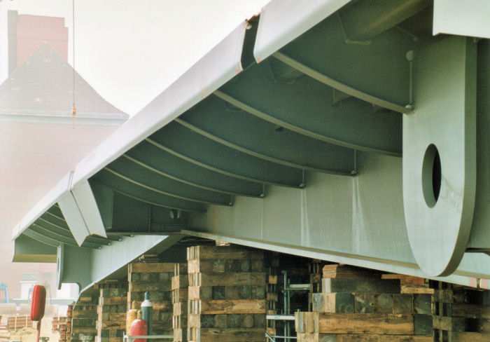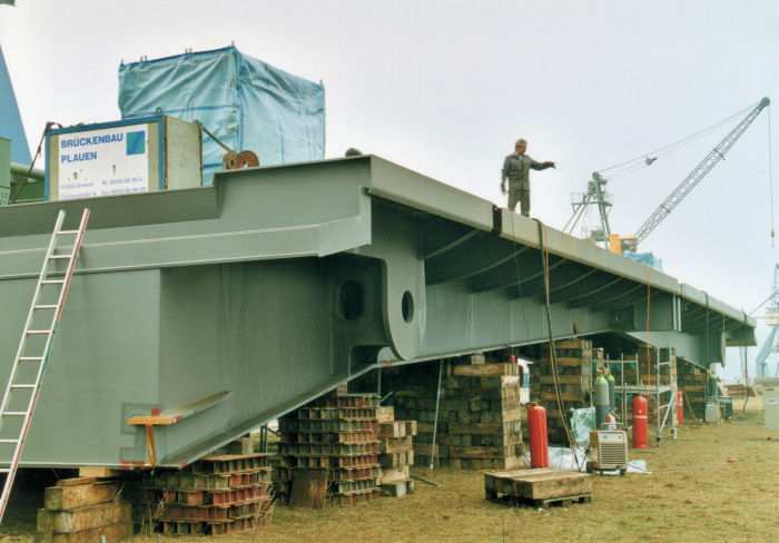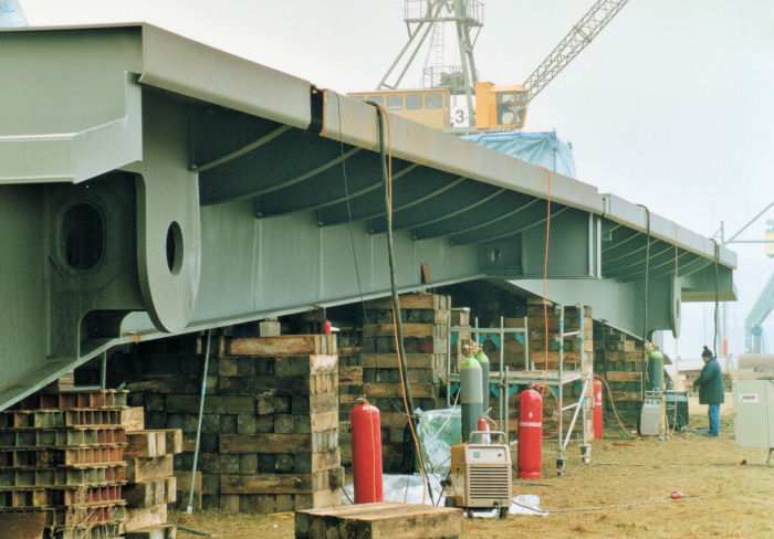 | 14.01.2002 - Kappeln/Schlei: Neubau einer Klappbrücke Flensburg - Harniskai: Zusammenbau der Brückenklappen Blick von einem Hafenkran auf das südliche Brückenklappenpaar A/B. Links im Bild: Westklappe A/B (Kappelner Seite). Rechts im Bild: Ostklappe A/B (Ellenberger Seite). Die Trennstelle zwischen beiden Klappen ist mit Paletten abgedeckt. Jede Klappe besteht aus drei Einzelsegmenten. Diese werden hier in Flensburg (Harniskai) zu je einer Klappe zusammengeschweißt. Nach dem Zusammenbau der Klappen werden in Flensburg noch folgende Arbeiten ausgeführt: # Dünnbeschichtung der Oberseiten (Fahrbahnen). # Anstrich der Klappen (seitlich und unten) mit weißer Farbe. # Einbau aller Drehlager # Einbau der Spitzen- und Rückarmriegel Die Seitengeländer werden erst in Kappeln angebaut. Das zweite Brückenklappenpaar C/D mit Geh- und Randweg befindet sich noch in der Fertigung in Niesky/Sachsen und wird von dort, wie obige Klappen, zur Endfertigung nach Flensburg gebracht. Dieses Klappenpaar ist um den Geh- und Radweg breiter als obige Klappen. Foto: Einar Maschmann - Kappeln - (C) 2002 |
