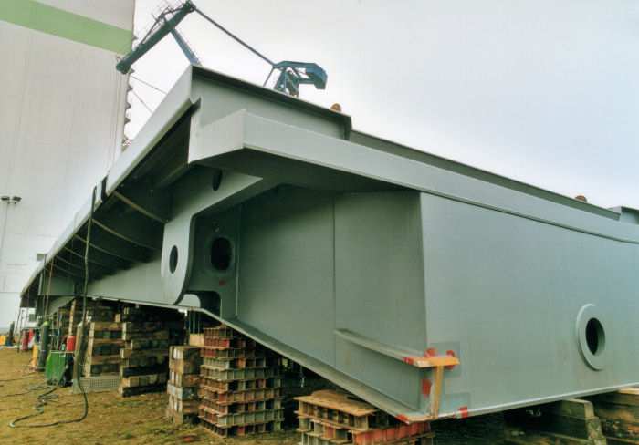 | 14.01.2002 - Kappeln/Schlei: Neubau einer Klappbrücke Flensburg - Harniskai: Zusammenbau der Brückenklappen Blick auf die Nordseite des südlichen Klappenpaares A/B. Im Vordergrund die Westklappe A/B mit ihrem Rückarm. In die Öffnung rechts im Bild wird der Rückarmriegel der Klappe eingebaut. Mit diesem Riegel wird die Klappe später in den beiden Stellungen Verkehrs- und Hochlage mechanisch verriegelt. Foto: Einar Maschmann - Kappeln - (C) 2002 |