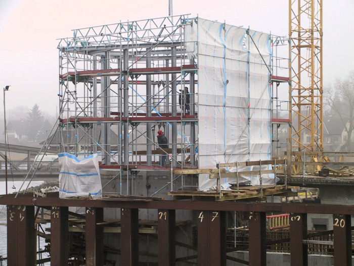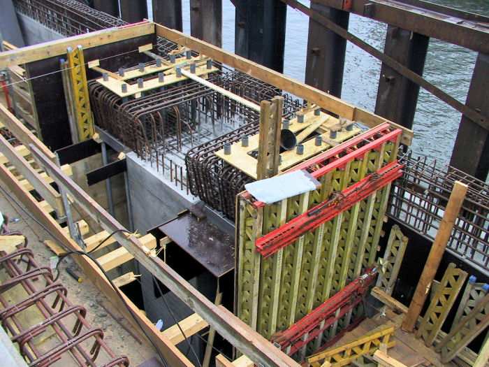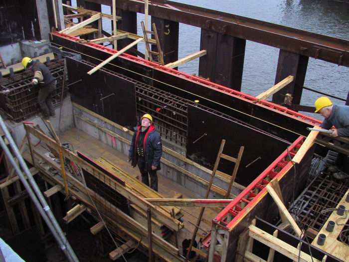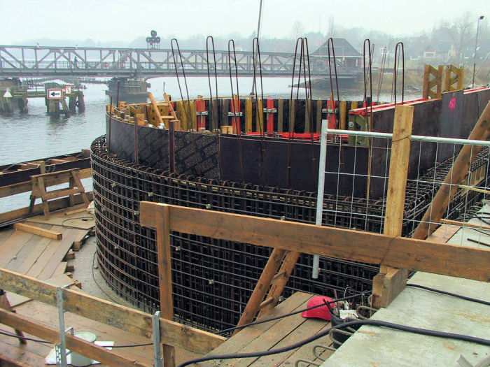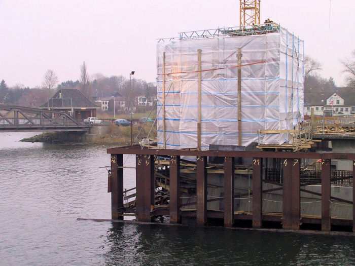 | 15.01.2002 - 15:04 Uhr - Kappeln/Schlei: Neubau einer Klappbrücke Pfeiler 40 Blick vom Südhafen in Richtung Südende vom Pfeiler 40. Der obere Teil des Treppenhauses wird gerade betoniert. Foto: Eckhard Schmidt - Kappeln - (C) 2002 |