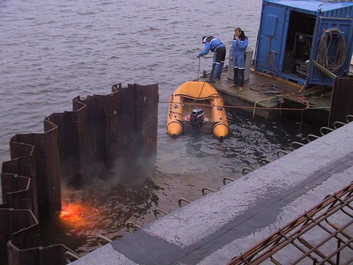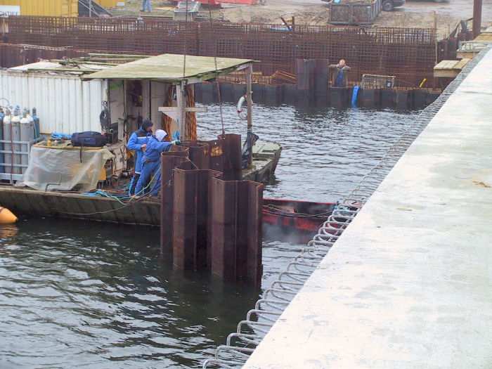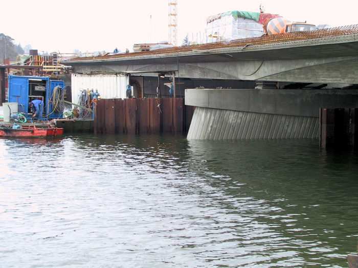 | 17.01.2002 - 15:09 Uhr - Kappeln/Schlei: Neubau einer Klappbrücke Pfeiler 20 Blick auf das Südende der Baugrube vom Pfeiler 20. Ein Taucher ist gerade dabei die Bohlen der Spundwand direkt über dem Schleiboden abzubrennen. Foto: Eckhard Schmidt - Kappeln - (C) 2002 |