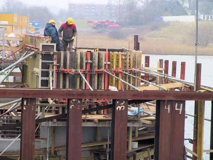 | 17.01.2002 - 11:43 Uhr - Kappeln/Schlei: Neubau einer Klappbrücke Brückenüberbau Kappeln Auch die Mitarbeiter des A-Teams aus Cottbus sind bald fertig mit dem Ausbau der Schalungsmodule des Brückenüberbaus Kappeln. Foto: Eckhard Schmidt - Kappeln - (C) 2002 |