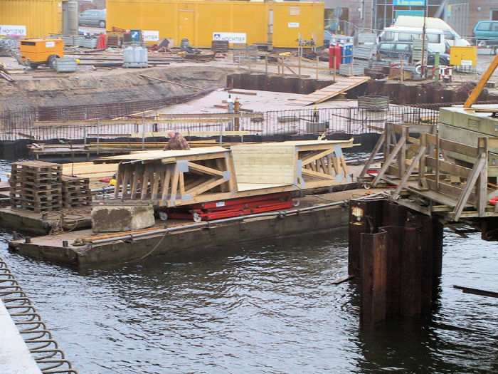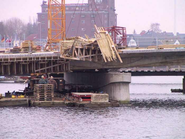 | 15.01.2002 - 15:04 Uhr - Kappeln/Schlei: Neubau einer Klappbrücke Brückenüberbau Kappeln Mitarbeiter des A-Teams aus Cottbus haben gerade wieder ein Modul der Schalung ausgebaut. Es wird gerade vom Turmdrehkran angehoben und westlich vom Widerlager 70 abgesetzt. Foto: Eckhard Schmidt - Kappeln - (C) 2002 |