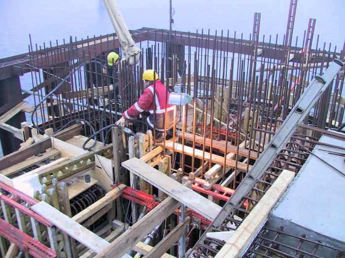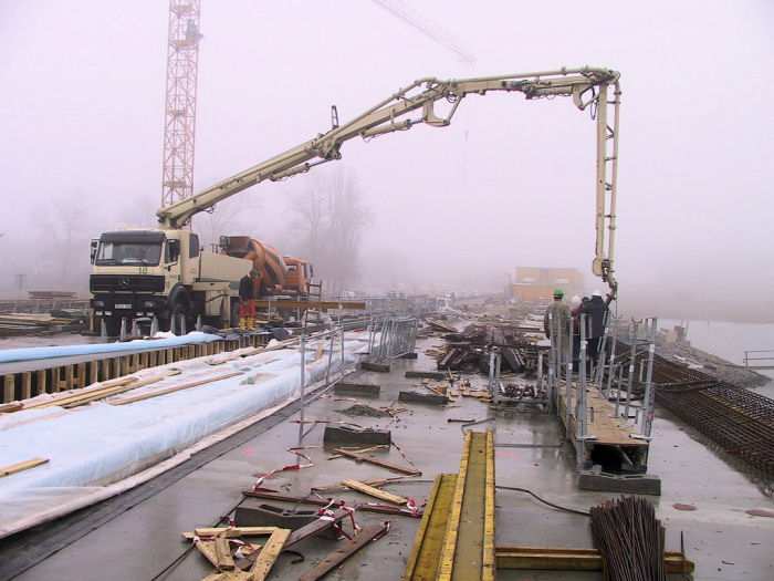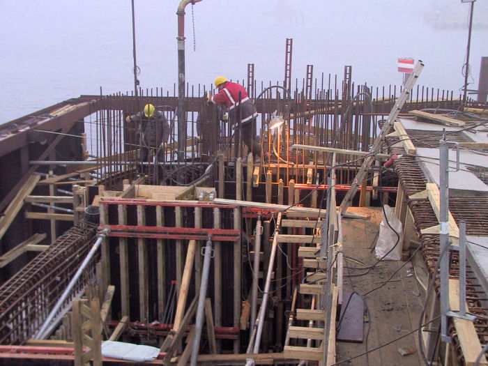 | 16.01.2002 - 15:21 Uhr - Kappeln/Schlei: Neubau einer Klappbrücke Pfeiler 50 Blick auf das Südende vom Pfeiler 50. Es wird gerade der untere Teil des Treppenhauses mit Hilfe des Betonverteilermastes betoniert. Foto: Eckhard Schmidt - Kappeln - (C) 2002 |