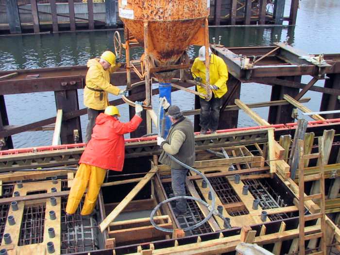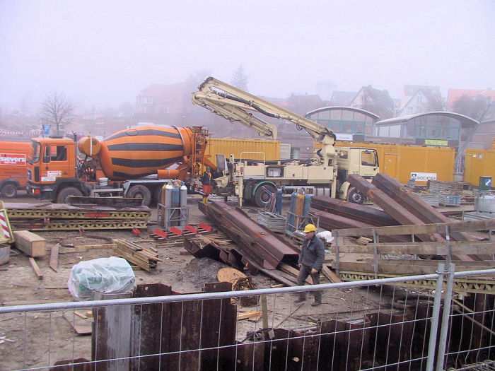 | 16.01.2002 - 11:08 Uhr - Kappeln/Schlei: Neubau einer Klappbrücke Pfeiler 20 Mit Hilfe einer LKW-Betonpumpe werden gerade die Granitsteine rund um den Pfeiler 20 mit Mörtel verklammert. Anschließend können die Bohlen der Spundwand der Baugrube direkt über dem Schleiboden abgebrannt werden. Foto: Eckhard Schmidt - Kappeln - (C) 2002 |