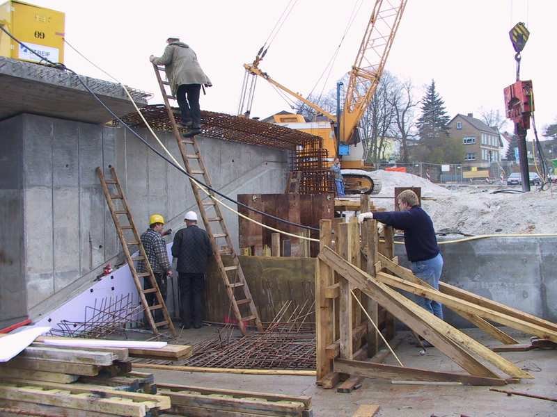 | 16.04.2002 - 12:05 Uhr - Kappeln/Schlei: Neubau einer Klappbrücke Südhafen / Widerlager 70 / Unterführung Blick von der Unterführung auf die südliche Eingangsrampe. Die Eisenflechter sind dabei die Bewehrung für die landseitige Betonmauer einzubringen und die Betonbauer bereiten bereits das Aufstellen der Schalwände vor. Foto: Eckhard Schmidt - Kappeln - (C) 2002 |