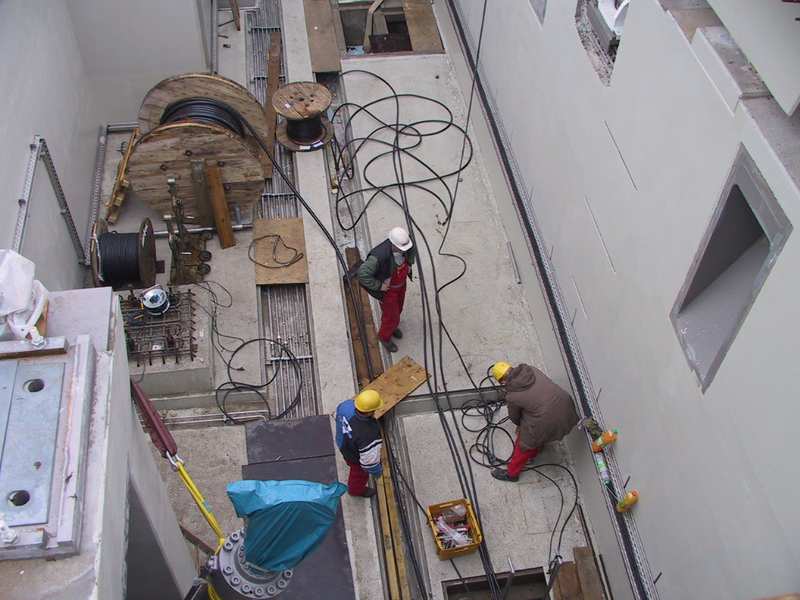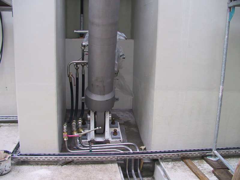 | 18.04.2002 - 11:21 Uhr - Kappeln/Schlei: Neubau einer Klappbrücke Pfeiler 50 Ich befinde mich im Maschinenraum auf dem Nordende vom Pfeiler 50. Zwei Monteure sind gerade dabei Stammkabel an die Unterverteiler der Hydraulikaggregate für die beiden Westklappen anzuschließen. Rechts im Bild sind Hydraulikleitungen zu erkennen. Hinter der Betonwand befindet sich der Klappenkeller des Pfeilers. Foto: Eckhard Schmidt - Kappeln - (C) 2002 |