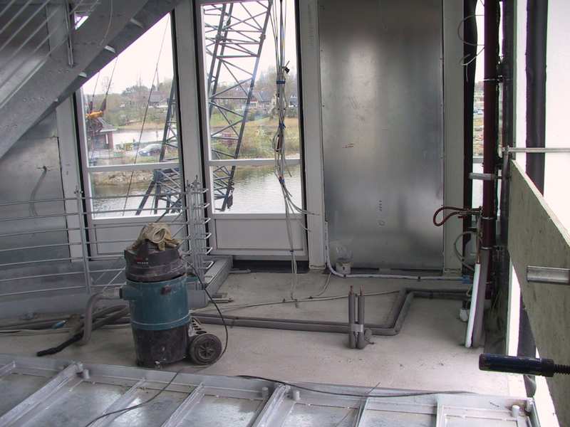 | 16.04.2002 - 11:13 Uhr - Kappeln/Schlei: Neubau einer Klappbrücke Pfeiler 40 - Brückenwärterhaus Ich befinde mich im Dachgeschoss des Brückenwärterhauses. In dieser Woche soll in allen drei Etagen der Estrich eingebracht werden. Foto: Eckhard Schmidt - Kappeln - (C) 2002 |