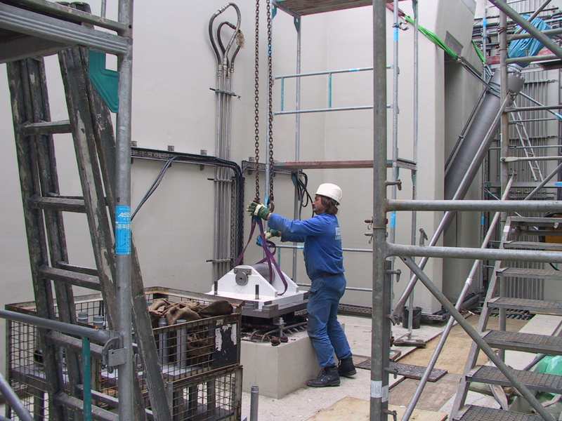 | 16.04.2002 - 14:39 Uhr - Kappeln/Schlei: Neubau einer Klappbrücke Pfeiler 40 Ich befinde mich im Klappenkeller des Pfeilers. Jürgen Weiß von der Firma imo-Leipzig setzt gerade die untere Rolle für die Verrieglung des Rückarmes der Ostklappe C/D in der Stellung Hochlage auf der Fundamentplatte im Klappenkeller ab. Über die Rohrleitungen an der westlichen Seitenwand des Pfeilers werden später über Druckschläuche die beiden Spitzenriegel und der Rückarmriegel der Ostklappe C/D mit Hydrauliköl versorgt. Wegen dem Ölspülen der Rohrleitungen sind die Hydraulikleitungen noch per Schlauchverbindungen kurzgeschlossen. Rechts im Bild ist in der Nische unter dem Fundament des Drehlagers D der Hydraulikzylinder der Ostklappe C/D zu erkennen. Drehlager der Klappen vom Pfeiler 40 Süden <-- -A- --- -B--C- --- -D- --> Norden Brückenüberbau Ellenberg Foto: Eckhard Schmidt - Kappeln - (C) 2002 |