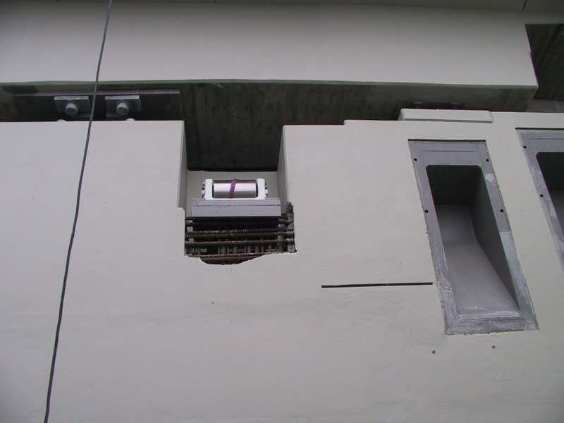 | 17.04.2002 - 13:54 Uhr - Kappeln/Schlei: Neubau einer Klappbrücke Pfeiler 40 Ich befinde mich im Klappenkeller des Pfeilers. Die obere Rolle für die Verrieglung des Rückarmes der Ostklappe C/D in der Stellung Verkehrslage wurde bereits auf der Fundamentplatte oben in der östlichen Seitenwand des Pfeilers abgesetzt. Die Fundamentplatten werden, wenn die Rollen für die Rückarmverriegelung richtig justiert sind, noch mit Pagel-Spezial-Beton vergossen werden. Foto: Eckhard Schmidt - Kappeln - (C) 2002 |