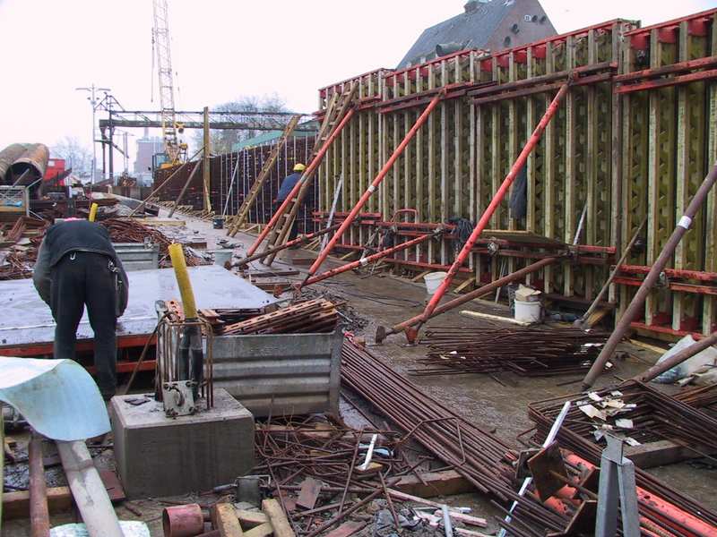 | 17.04.2002 - 14:45 Uhr - Kappeln/Schlei: Neubau einer Klappbrücke Südhafen / Widerlager 70 / Unterführung Blick von der Unterführung auf die südliche Eingangsrampe. Die Betonbauer stellen gerade für die landseitige Betonmauer die Schalwände auf. Foto: Eckhard Schmidt - Kappeln - (C) 2002 |