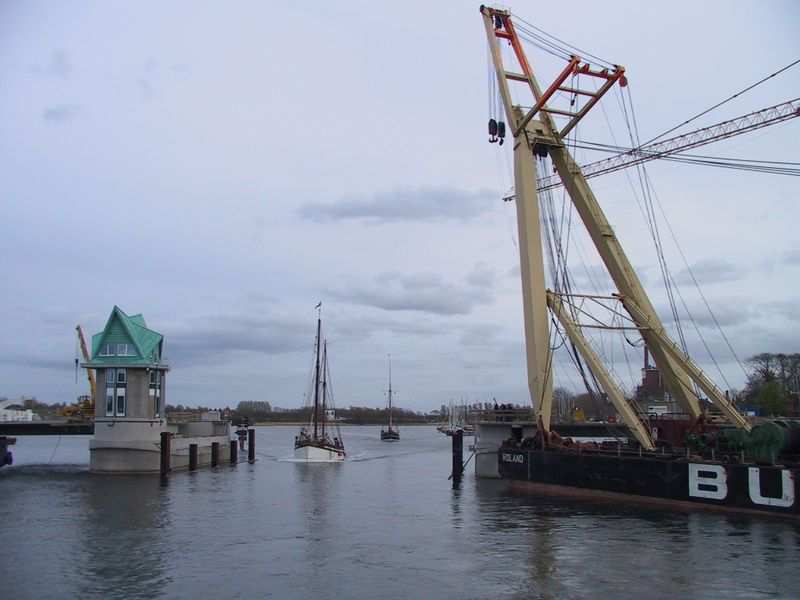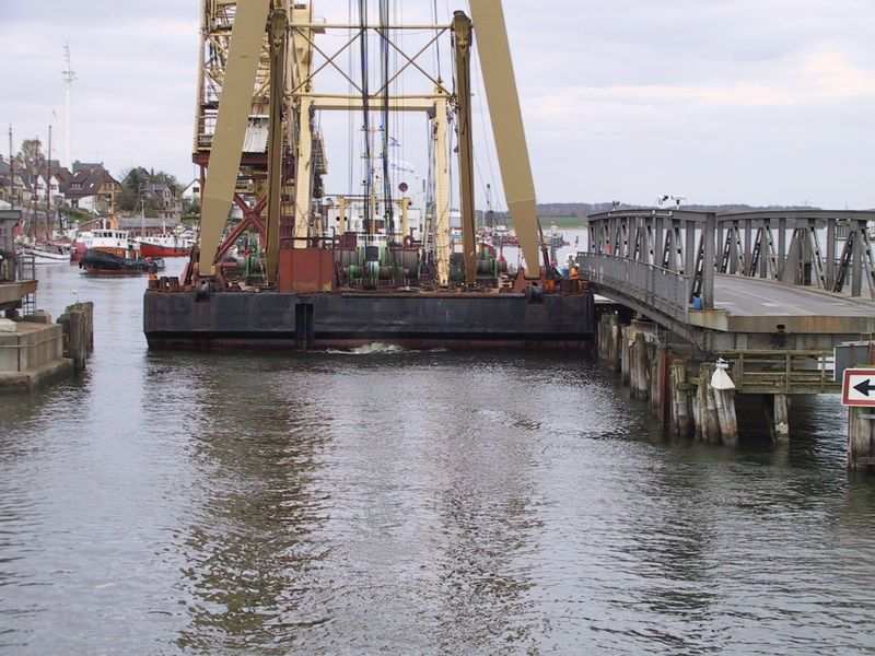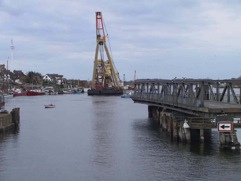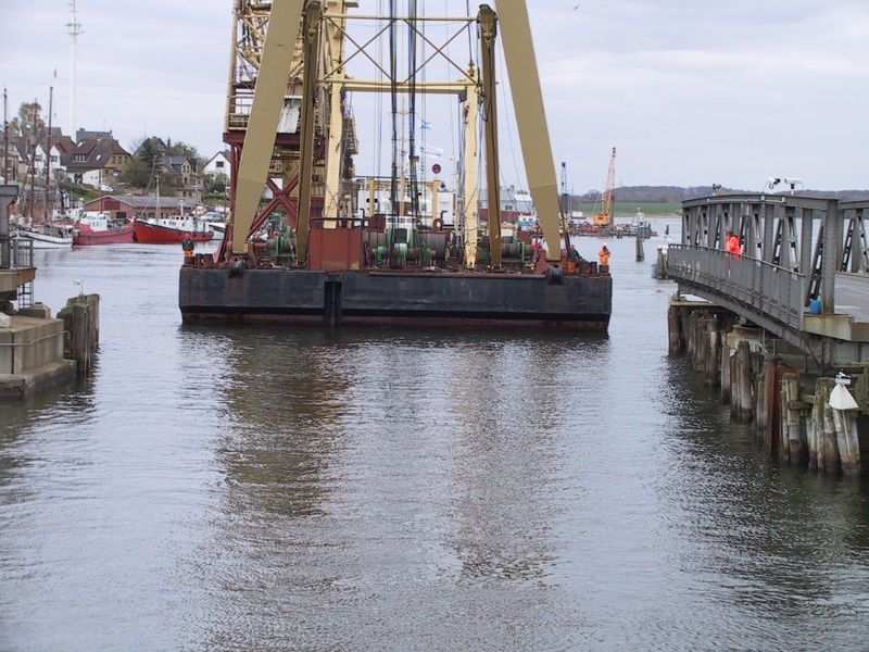 | 23.04.2002 - 17:00:22 Uhr - Kappeln/Schlei: Neubau einer Klappbrücke Ankunft des Schwimmkranes ROLAND in Kappeln Der Schwimmkran ROLAND nähert sich langsam von Norden her der Brückenbaustelle. Er wurde mit Hilfe eines Schleppers nach Kappeln gebracht. Das letzte Stück bis zur Baustelle legt der Schwimmkran mit seinen eigenen Antrieben zurück. Als Antriebe stehen drei Schottel-Propeller zur Verfügung. Abmessungen des Schwimmkranes (Ponton): 76 m x 24 m (Länge x Breite) Das Drehteil der Drehbrücke ist noch geschlossen. Gleich wird Brückenwärter Bernd Uwe Hansen die Brücke für den Verkehr sperren und das Drehteil öffnen. In der Brückendurchfahrt der Drehbrücke wurden alle Schwimmfender entfernt, damit der Schwimmkran mit einer Breite von 24 m die Brücke passieren kann. Es wird ziemlich eng werden auf beiden Seiten des Schwimmkranes. Lage der Schleibrücken (Dreh- und Klappbrücke) --- Zeichnung der Klappbrücke Bauphasen der Klappenpfeiler --- Visualisierung der Klappbrücke Foto: Eckhard Schmidt - Kappeln - (C) 2002 |