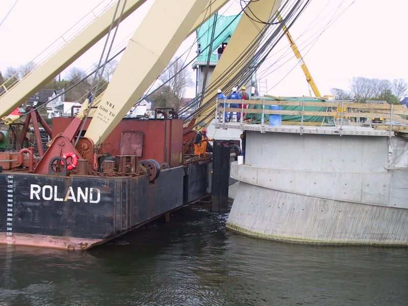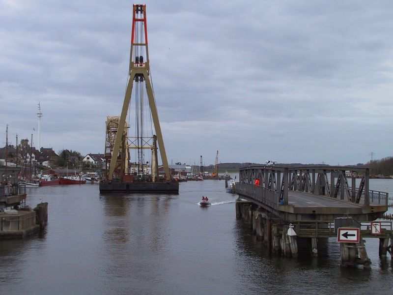 | 23.04.2002 - 17:32:32 Uhr - Kappeln/Schlei: Neubau einer Klappbrücke Ankunft des Schwimmkranes ROLAND in Kappeln Der Schwimmkran ist jetzt frei vom Pfeiler III der Drehbrücke. Foto: Eckhard Schmidt - Kappeln - (C) 2002 |