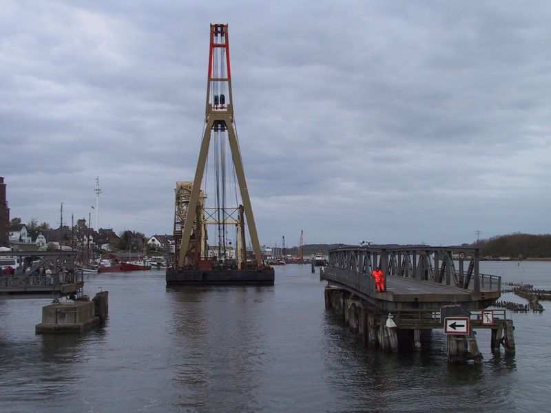 | 23.04.2002 - 17:01:58 Uhr - Kappeln/Schlei: Neubau einer Klappbrücke Ankunft des Schwimmkranes ROLAND in Kappeln Bernd Uwe Hansen hat den Verkehr angehalten und das Drehteil beginnt sich bereits zu drehen. Die Drehbrücke wurde etwa von 17:01 Uhr bis 17:34 Uhr für den Verkehr gesperrt. Foto: Eckhard Schmidt - Kappeln - (C) 2002 |
