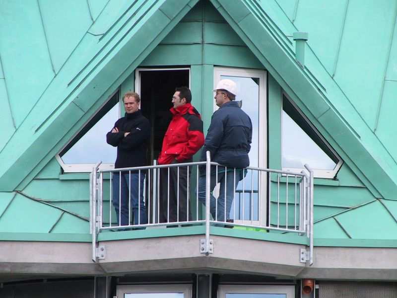 | 23.04.2002 - 17:07:29 Uhr - Kappeln/Schlei: Neubau einer Klappbrücke Ankunft des Schwimmkranes ROLAND in Kappeln Vom Balkon des Brückenwärterhaus beobachtet die Bauleitung der Baufirma HOCHTIEF die Ankunft des Schwimmkranes. Foto: Eckhard Schmidt - Kappeln - (C) 2002 |