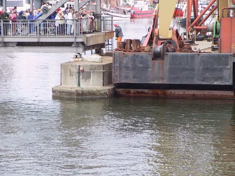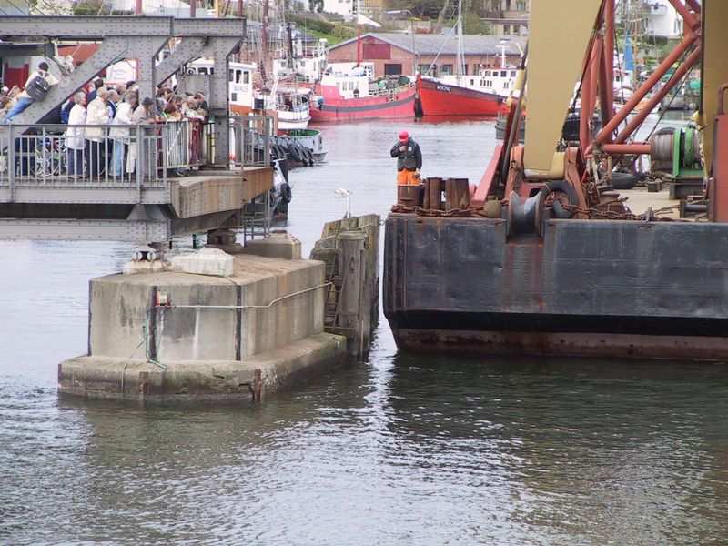 | 23.04.2002 - 17:11:13 Uhr - Kappeln/Schlei: Neubau einer Klappbrücke Ankunft des Schwimmkranes ROLAND in Kappeln Der Schwimmkran schrammt mit seiner Steuerbordseite am Betonsockel des Pfeiler III vorbei. Auf der Drehbrücke haben sich auch zahlreiche Zuschauer eingefunden, um das Spektakel aus der ersten Reihe zu verfolgen. Foto: Eckhard Schmidt - Kappeln - (C) 2002 |