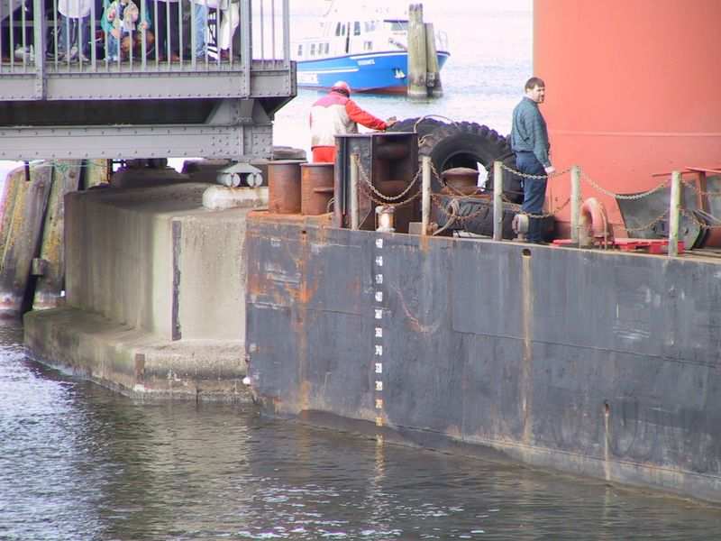 | 23.04.2002 - 17:24:35 Uhr - Kappeln/Schlei: Neubau einer Klappbrücke Ankunft des Schwimmkranes ROLAND in Kappeln Das Heck des Schwimmkranes schrammt am Betonsockel des Pfeiler III vorbei. Dabei bröckelt etwas Beton ab. Foto: Eckhard Schmidt - Kappeln - (C) 2002 |
