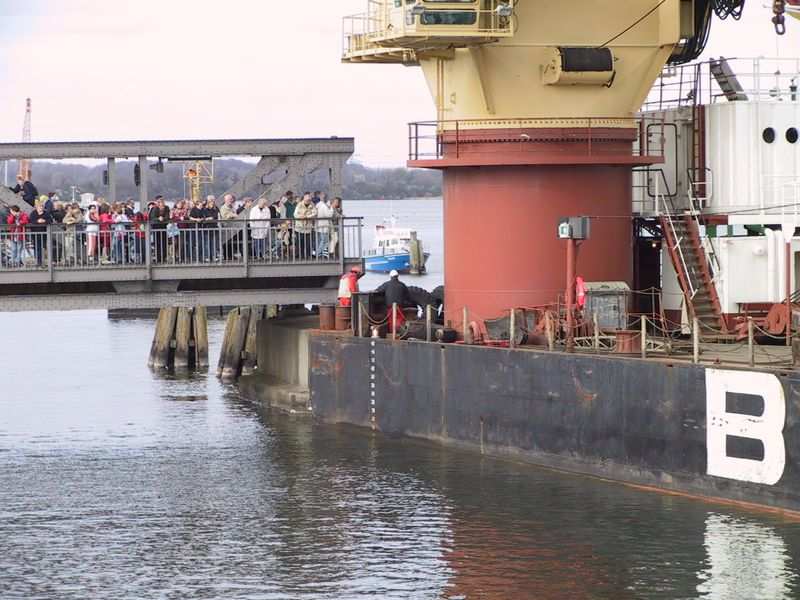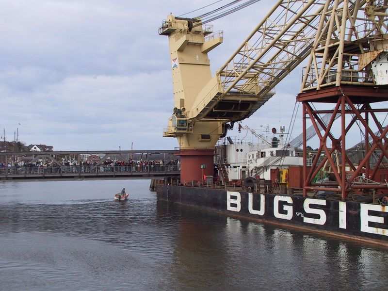 | 23.04.2002 - 17:27:44 Uhr - Kappeln/Schlei: Neubau einer Klappbrücke Ankunft des Schwimmkranes ROLAND in Kappeln Langsam dreht der Schwimmkran mit seinem Heck in Richtung Kappeln. Auf der Drehbrücke haben sich viele Zuschauer eingefunden, um das Manöver aus nächster Nähe zu beobachten. Ein solch großer Schwimmkran besucht ja nicht jeden Tag Kappeln. Foto: Eckhard Schmidt - Kappeln - (C) 2002 |
