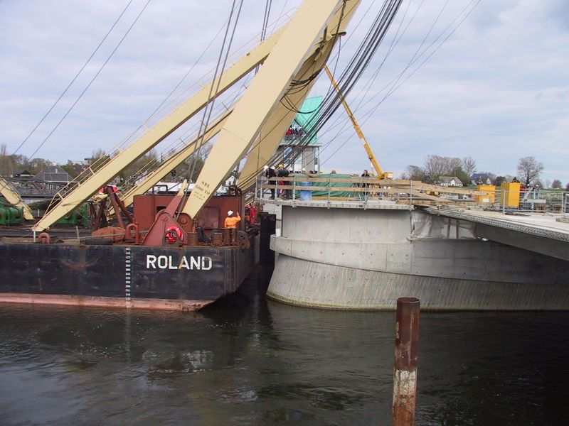 | 23.04.2002 - 17:03:02 Uhr - Kappeln/Schlei: Neubau einer Klappbrücke Ankunft des Schwimmkranes ROLAND in Kappeln Das Drehteil der Drehbrücke ist noch nicht voll geöffnet. Der Schwimmkran ist jetzt in voller Grüße zu erkennen. Foto: Eckhard Schmidt - Kappeln - (C) 2002 |