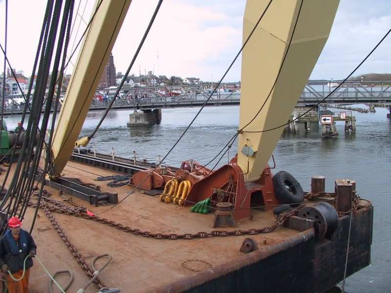 | 23.04.2002 - 17:10:02 Uhr - Kappeln/Schlei: Neubau einer Klappbrücke Ankunft des Schwimmkranes ROLAND in Kappeln Langsam schiebt sich der Schwimmkran in die Brückendurchfahrt hinein. Foto: Eckhard Schmidt - Kappeln - (C) 2002 |