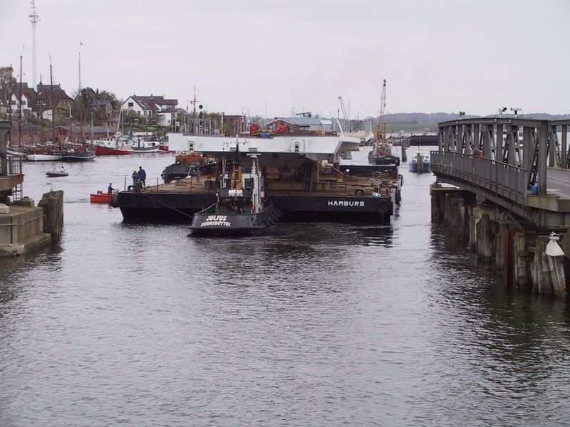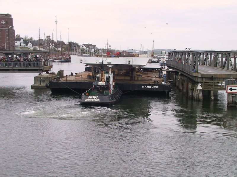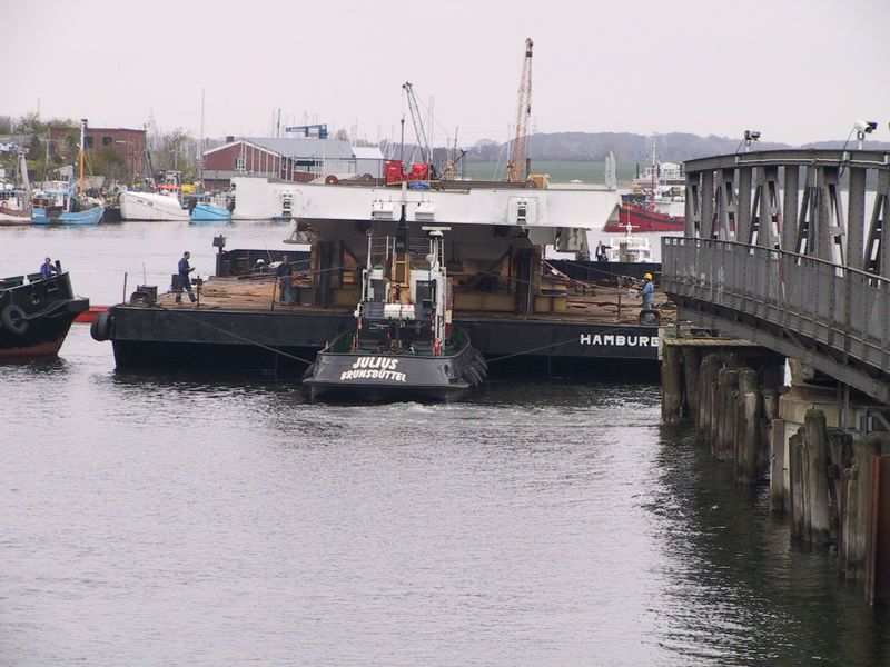 | 24.04.2002 - 16:50 Uhr - Kappeln/Schlei: Neubau einer Klappbrücke Ankunft vom SEEPONTON 5 mit dem nördlichen Klappenpaar C/D in Kappeln Langsam zieht der Schlepper JULIUS den SEEPONTON 5 durch die Brückendurchfahrt der Drehbrücke. Schleppverband: SEEPONTON 5 ---> JULIUS Foto: Eckhard Schmidt - Kappeln - (C) 2002 |