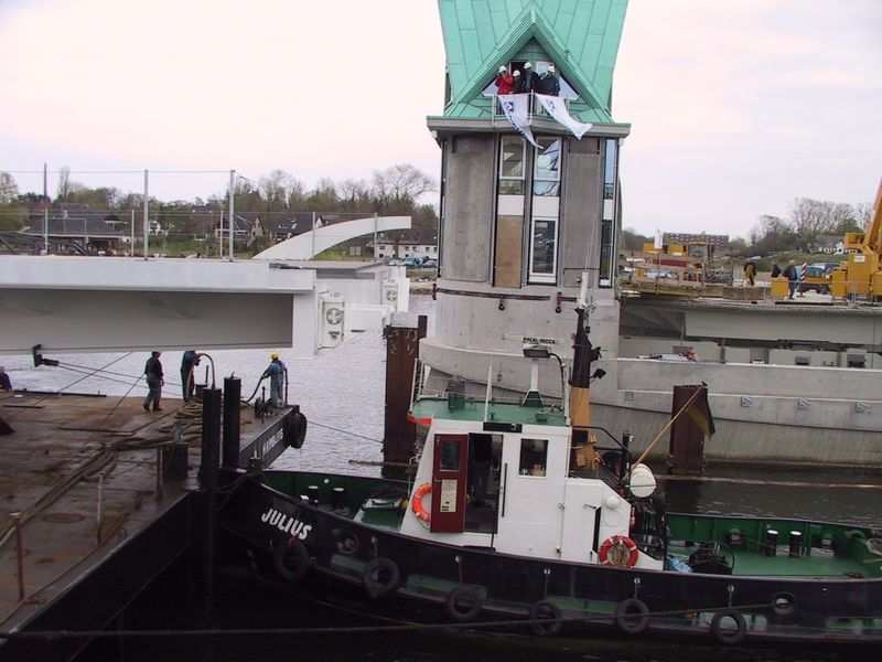 | 24.04.2002 - 16:39 Uhr - Kappeln/Schlei: Neubau einer Klappbrücke Ankunft vom SEEPONTON 5 mit dem nördlichen Klappenpaar C/D in Kappeln Außerplanmäßige Brückenöffnung: 16:37 Uhr - Brückenwärter: Bernd Uwe Hansen Langsam nähert sich der Schleppverband mit dem Schlepper JULIUS der Drehbrücke. Der Schlepper MANUS liegt links außerhalb des Bildes. Seitlich wird der SEEPONTON 5 von kleinen Arbeitsbooten der Firma Ostseedienst aus Kappeln in Position gehalten. Der Schlepper JULIUS ist mit dem Bug direkt am SEEPONTON 5 befestigt und fährt rückwärts in Richtung Brückenbaustelle. Schleppverband: SEEPONTON 5 ---> JULIUS Siehe Anordnung der vier Klappen und Segmente einer Klappe Siehe auch: Anordnung der Klappenpaare A/B und C/D mit den zugehörigen Komponenten Lage der Schleibrücken (Dreh- und Klappbrücke) --- Zeichnung der Klappbrücke Bauphasen der Klappenpfeiler --- Visualisierung der Klappbrücke Foto: Eckhard Schmidt - Kappeln - (C) 2002 |
