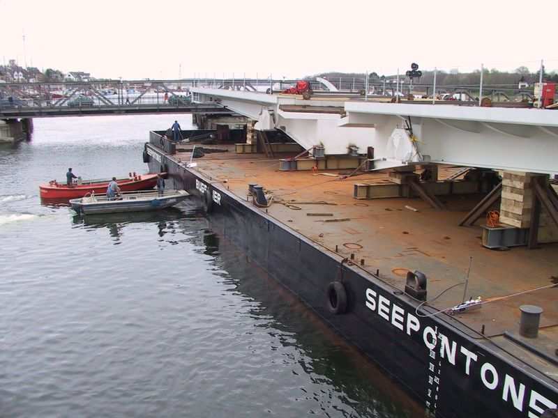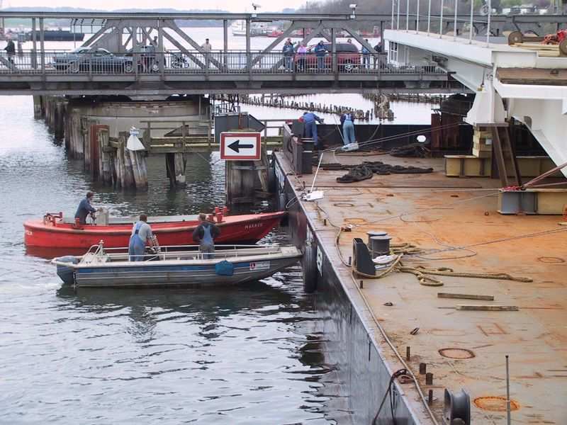 | 24.04.2002 - 16:57 Uhr - Kappeln/Schlei: Neubau einer Klappbrücke Ankunft vom SEEPONTON 5 mit dem nördlichen Klappenpaar C/D in Kappeln Jetzt können die Arbeitsboote der Firma Ostseedienst den SEEPONTON 5 in Richtung Ellenberg drücken. Im Hintergrund rollt der Verkehr bereits wieder über die Drehbrücke. Foto: Eckhard Schmidt - Kappeln - (C) 2002 |