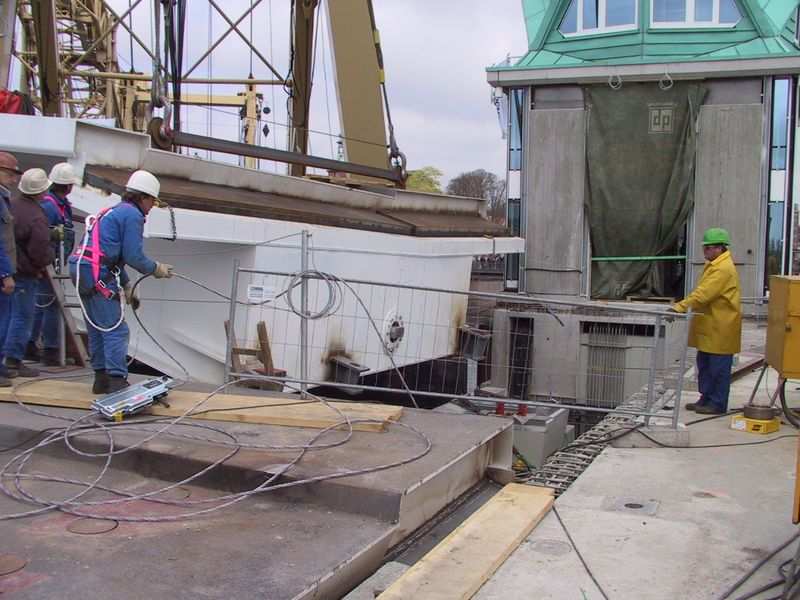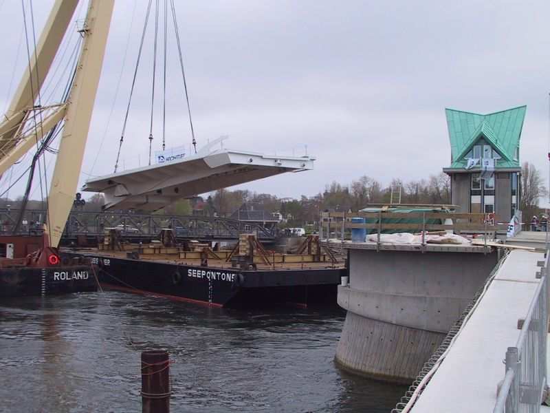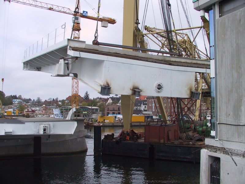 | 25.04.2002 - 13:47 Uhr - Kappeln/Schlei: Neubau einer Klappbrücke Einhängen der Klappen des nördlichen Klappenpaares C/D Blick auf die Ostklappe C/D. Die Lastseile des Schwimmkranes ROLAND können jetzt ausgehängt werden. Foto: Eckhard Schmidt - Kappeln - (C) 2002 |