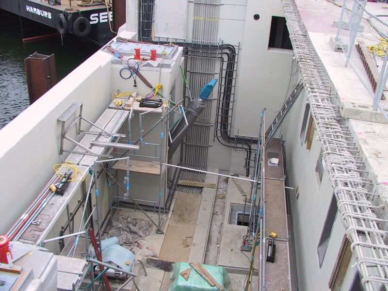 | 25.04.2002 - 10:30 Uhr - Kappeln/Schlei: Neubau einer Klappbrücke Einhängen der Klappen des nördlichen Klappenpaares C/D Blick von der Ostklappe A/B in den Klappenkeller des Pfeiler 40. Links im Bild die obere Fundamentplatte des Drehlagers D und rechts im Bild die obere Fundamentplatte des Drehlagers C der nördlichen Ostklappe C/D. Foto: Eckhard Schmidt - Kappeln - (C) 2002 |