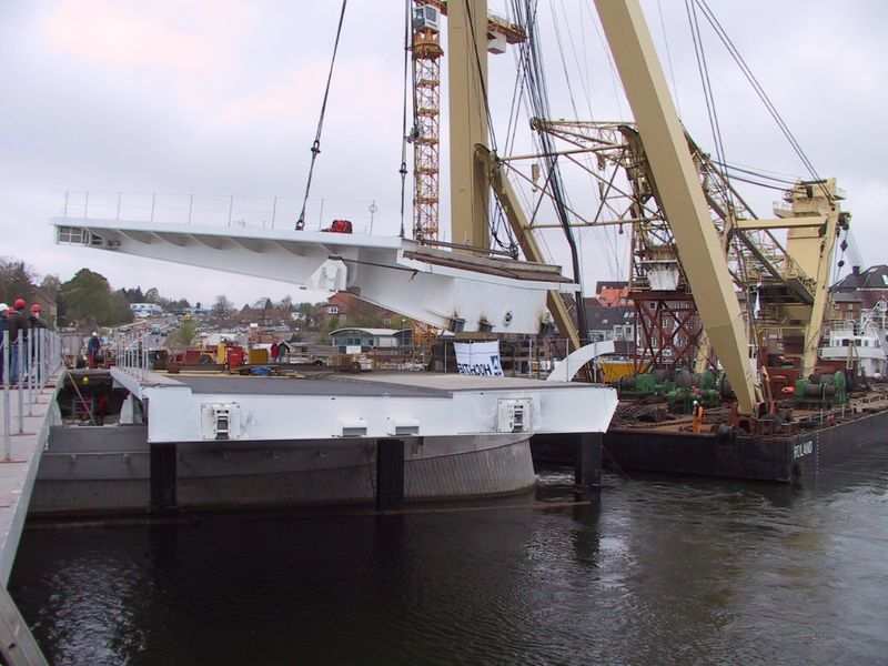 | 25.04.2002 - 13:45 Uhr - Kappeln/Schlei: Neubau einer Klappbrücke Einhängen der Klappen des nördlichen Klappenpaares C/D Blick vom nördlichen Klappenpaar C/D auf das Oberdeck des Schwimmkranes ROLAND. Foto: Eckhard Schmidt - Kappeln - (C) 2002 |