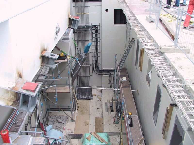 | 25.04.2002 - 10:28 Uhr - Kappeln/Schlei: Neubau einer Klappbrücke Einhängen der Klappen des nördlichen Klappenpaares C/D Blick von der Ostklappe A/B in den Klappenkeller des Pfeiler 40. Hier soll gleich die Ostklappe C/D mit ihren beiden Drehlagern auf die zugehörigen oberen Fundamentplatten abgesetzt werden. Oben in der Mitte des Bildes ist der Hydraulikzylinder der Ostklappe C/D in der Nische unter dem Fundament vom Drehlager D zu erkennen. Foto: Eckhard Schmidt - Kappeln - (C) 2002 |