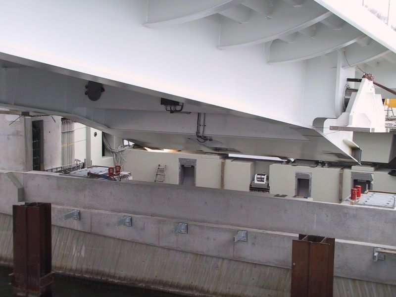| 25.04.2002 - 10:57 Uhr - Kappeln/Schlei: Neubau einer Klappbrücke Einhängen der Klappen des nördlichen Klappenpaares C/D Die nördliche Ostklappe schwebt jetzt über dem Pfeiler 50 und dem Brückenüberbau Kappeln. Blick auf die Unterseite der Klappe. Im Hintergrund wurde gerade die Drehbrücke geöffnet, damit die Schlepper den SEEPONTON 5 abholen können. Foto: Eckhard Schmidt - Kappeln - (C) 2002 |
